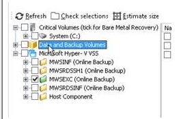 - You’ll still be able to select the C volume, but the Bare Metal Recovery option must be unchecked, as well as anything under the Microsoft Hyper-V VSS that does not carry the name of a VM.