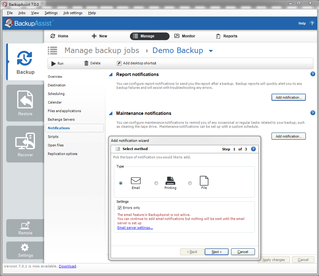 - Setting up email notifications in BackupAssist