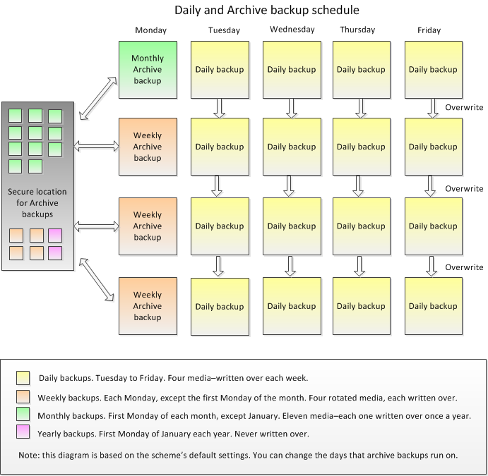 Below is a diagram of the Grandfather-father-son scheme we selected, which graphically shows how the layered protection of daily and archive backups can protect your data using BackupAssist.