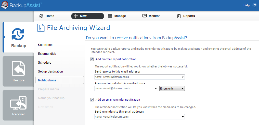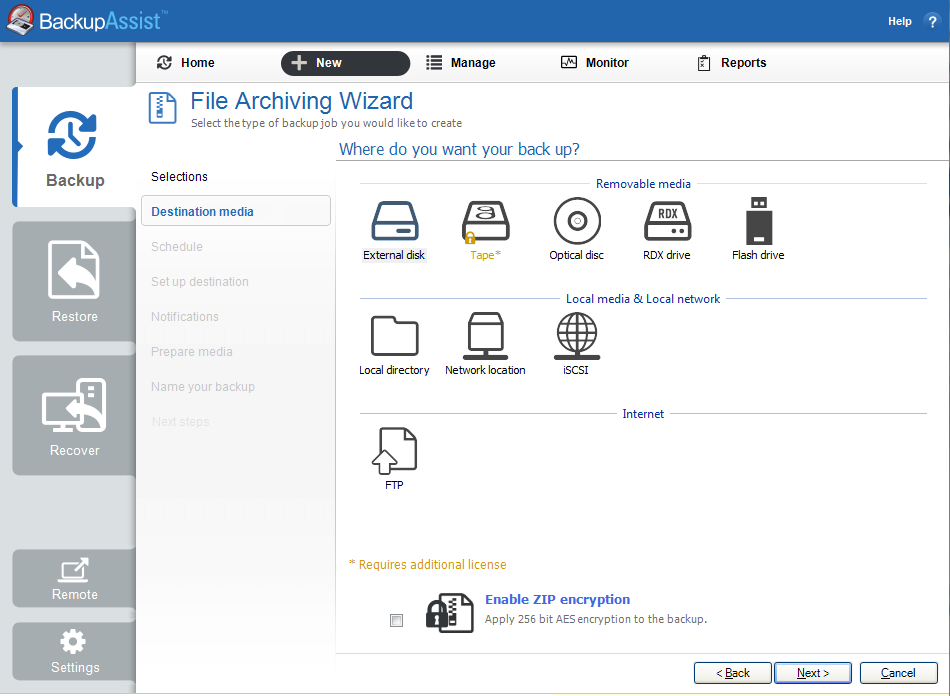 BackupAssist File Archiving is a file-based backup that works with both disk devices (e.g. external HDDs, CD/DVDs, RDX drives, NAS, FTP servers) and tape drives, with the BackupAssist Zip-To-Tape Add-on.