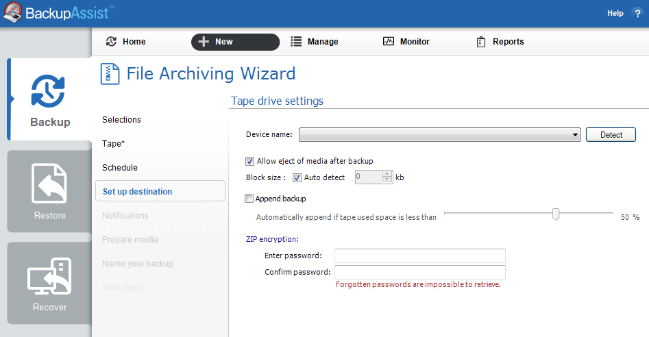 File Archiving is a standard feature included with the BackupAssist license. To back up data to a tape drive requires the BackupAssist Zip-To-Tape Add-on license, once the initial trial period has expired.