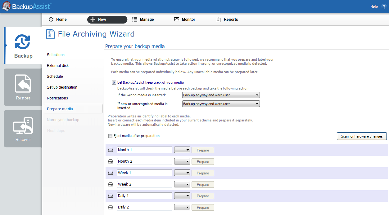 Configure your backup jobs to run full, incremental, differential and copy backups. Every time a File Archiving job runs, BackupAssist will check the archive bit of each file selected and take the appropriate action according to the type of backup scheduled. This means you can use inbuilt rotation schemes like "Full plus incremental", or create your own personalized schedules.