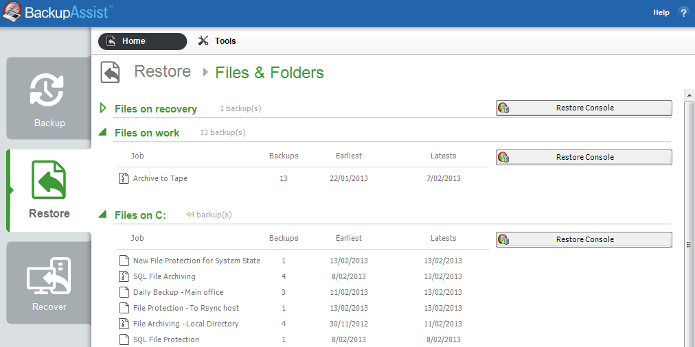 BackupAssist comes with its own Restore Console, which helps you restore files and directories from a File Archive backup, including backups to tape. The Restore Console also allows you to search for specific files to restore. You can even select which version of a file to restore if the same file is located in multiple backup sets.