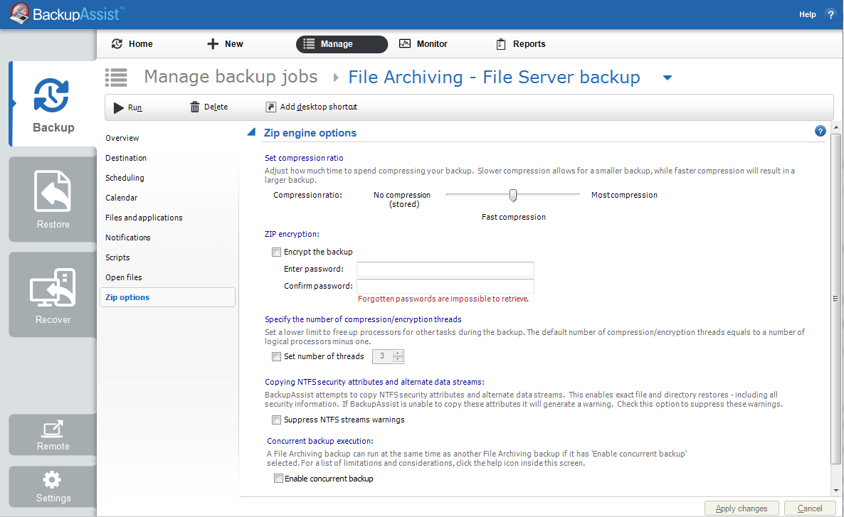 By default BackupAssist will store NTFS security attributes and alternate data streams of directories within your archive backup. Doing so means you are able to restore exact copies of your original data, including all security information. BackupAssist will try and store NTFS security attributes and alternate data streams that are set in the original source files and backed up to ZIP.