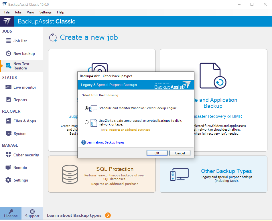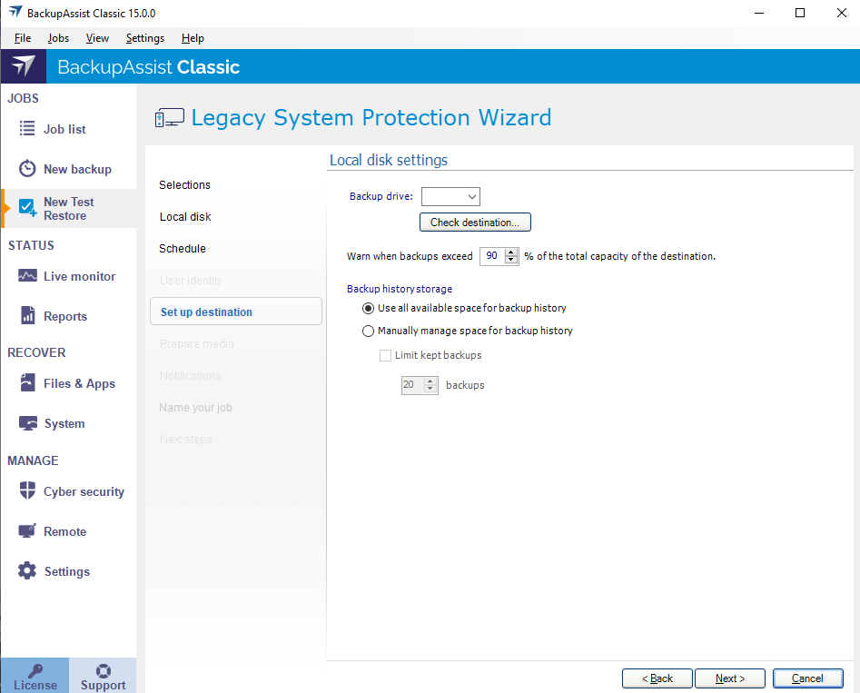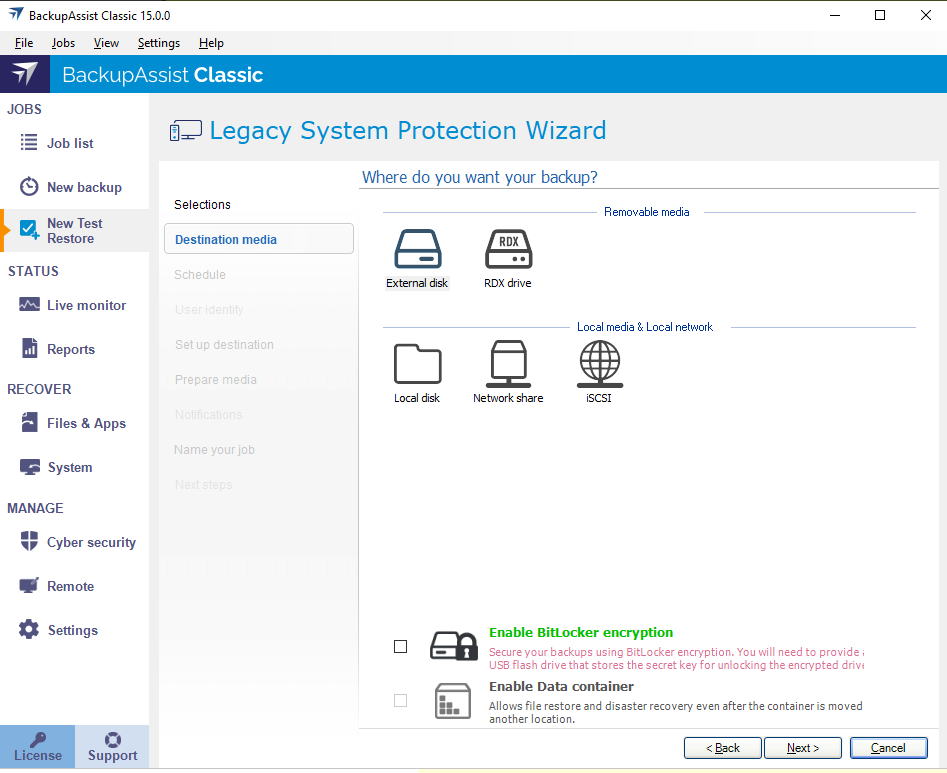 BackupAssist Legacy System Protection backs up your data to an image file backup that can be used to perform a system recovery. If you have BackupAssist v12 or later, see the new Advanced System Protection guide.