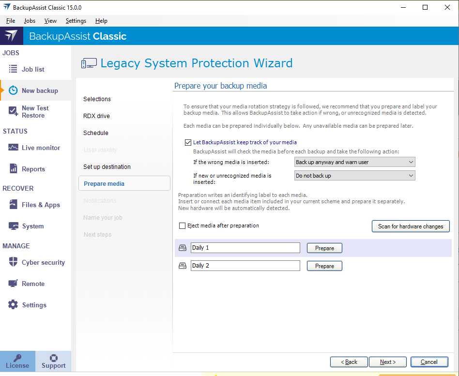 If you selected BitLocker, this step will allow you to prepare the Media for BitLocker and label it. If you are not using BitLocker, but are using external drives, we recommend Editing the backup job once you have created it and using the Prepare Media option to label each drive. - Let BackupAssist keep track of your media. Deselect this if you do not want to prepare and label your media.