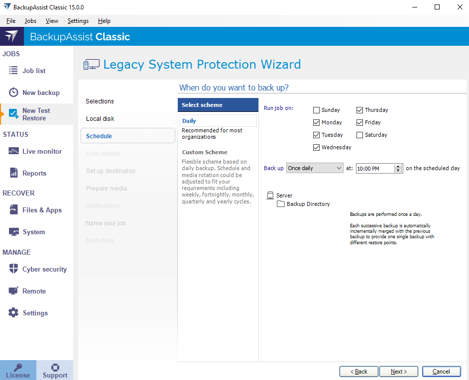 This step is used to select when (days and times of the week) and how you want the backup job to run, and how long you would like the backup to be retained for. A selection of pre-configured schedules, called schemes, as well as a custom scheme, can be selected. - The schemes available will depend on the type of destination media selected in step 5.