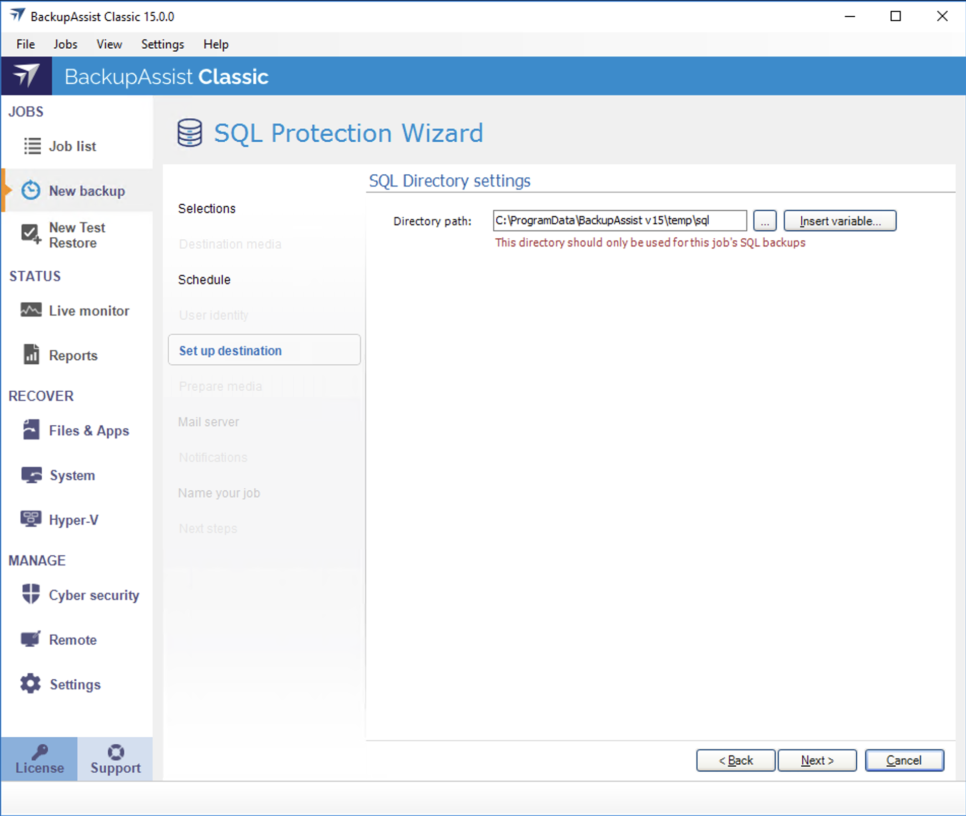 This location is used for both Basic and Transaction backups of the local SQL Server, as well as any remote SQL servers that were selected. The files are saved locally because the scheduling is tied to the Basic and Transactional backup types, rather than different destinations and media rotations. However, you can create a File Archiving or File Protection backup job to move the SQL backup to another destination. This also allows you to use additional backup schemes to create archive backups that can be moved to secure location, using whatever destination is supported by the backup type.