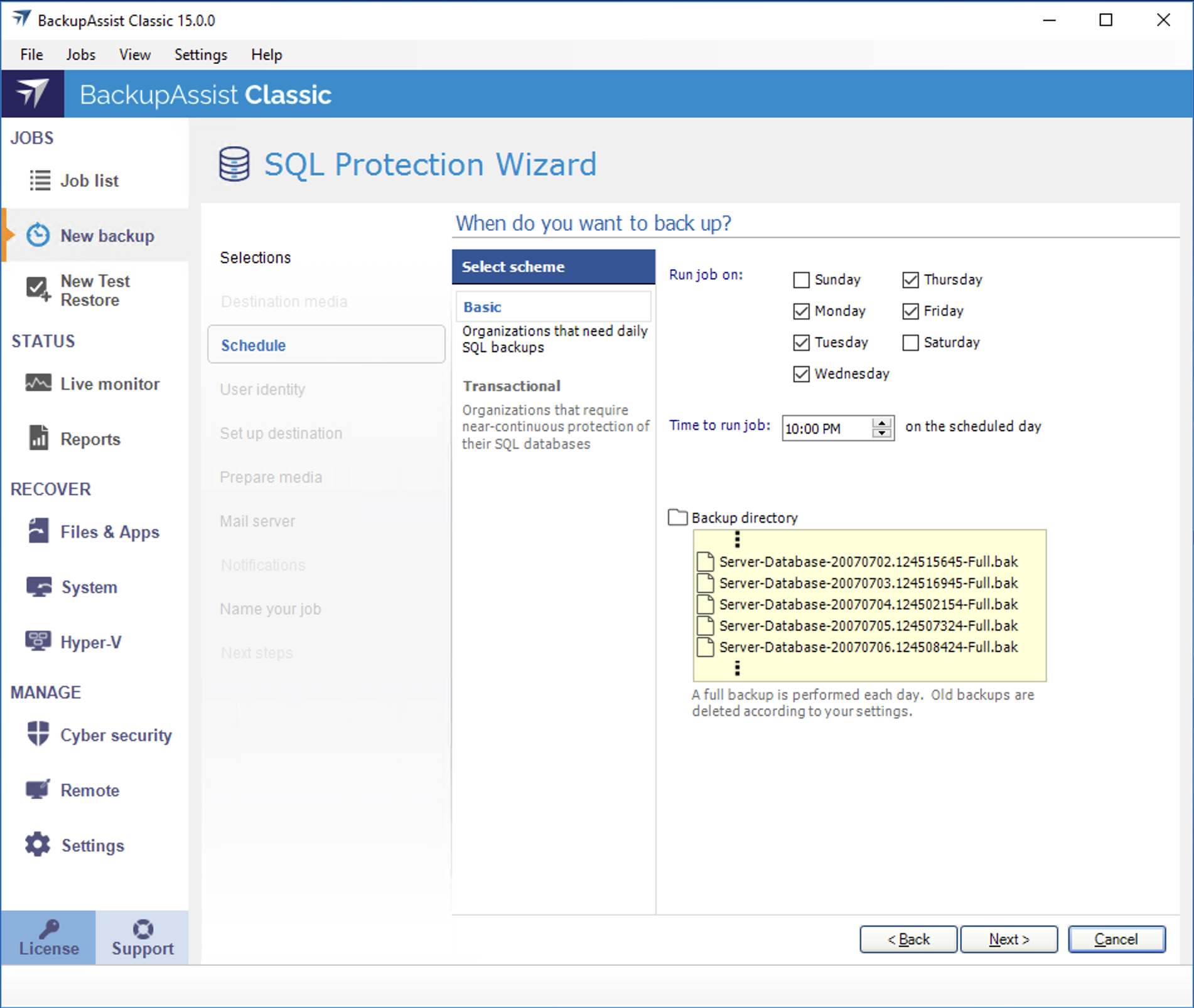This scheme creates a backup of the selected SQL databases. The backup job is run once per day at the time set in this screen.