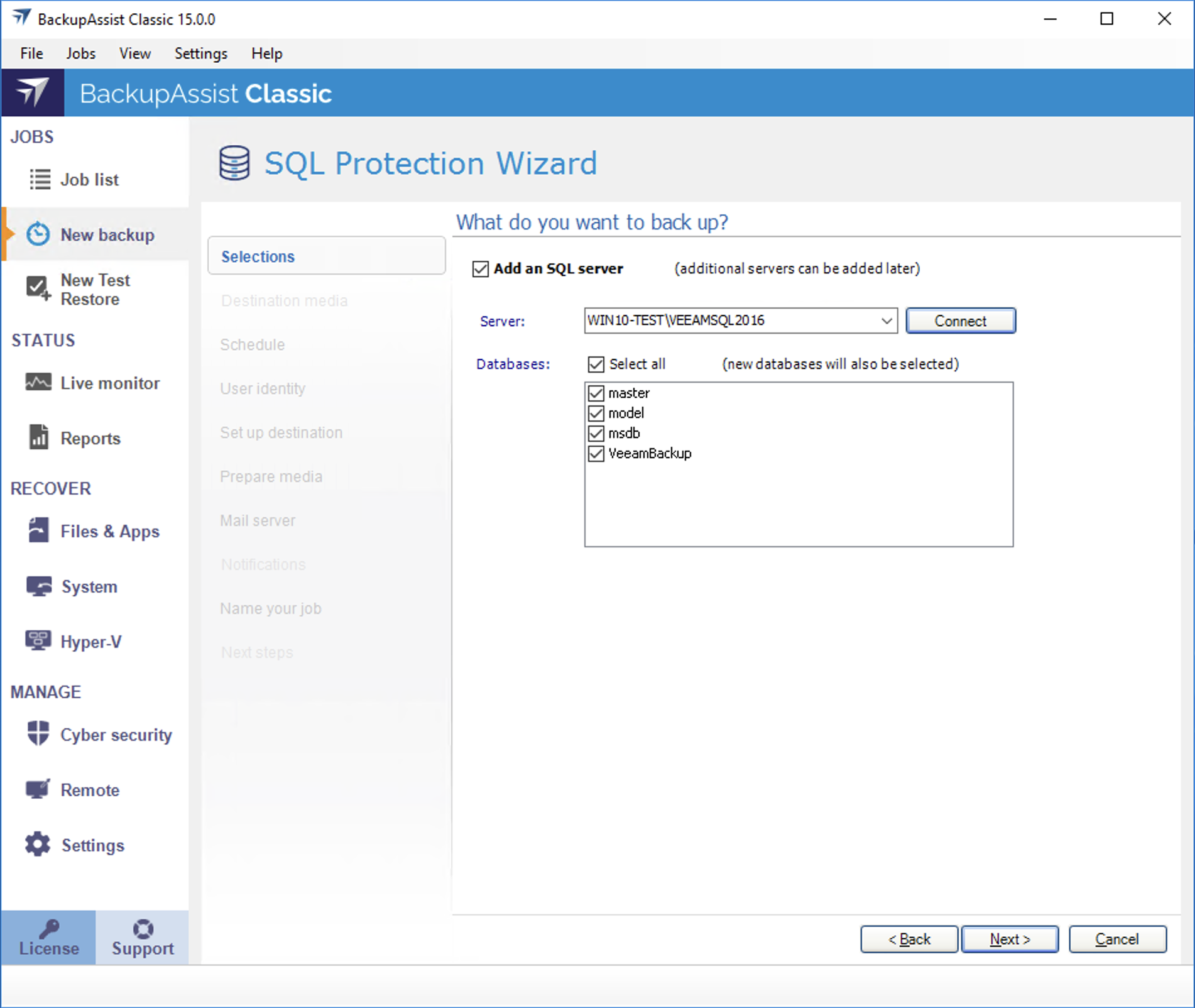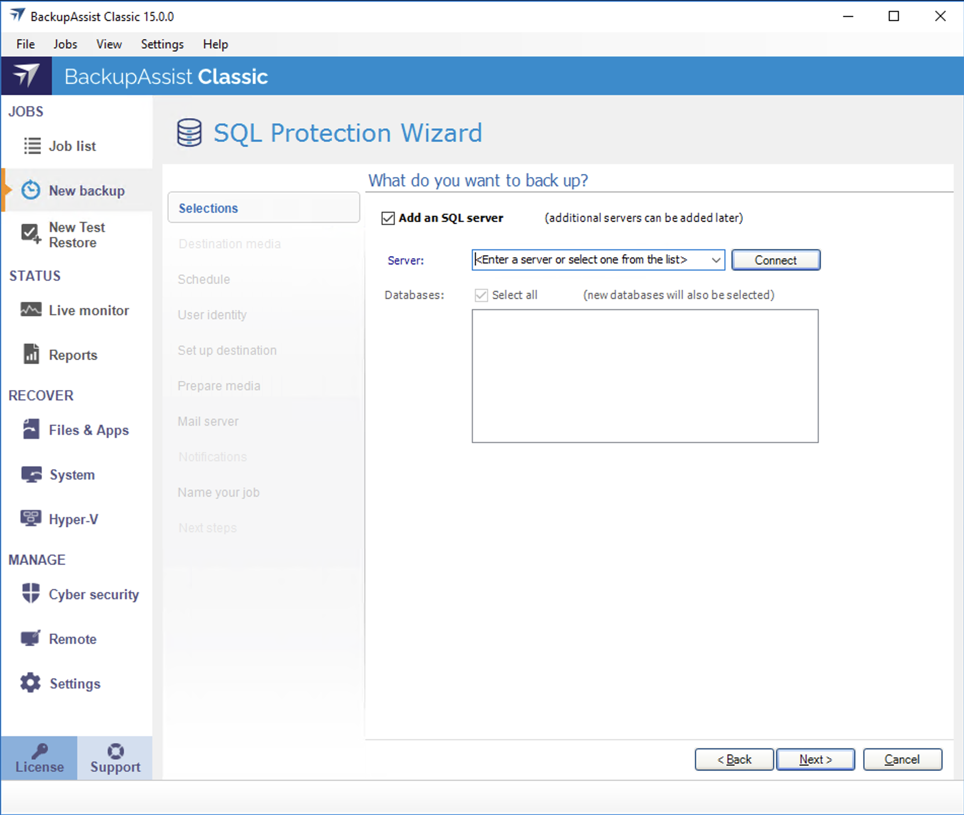 SQL Protection is a dedicated SQL backup type in the New backup tab. It uses the SQL Continuous add-on to backup local and remote SQL Servers. The local backups can be used for point-in-time database restores and full SQL Server restores.