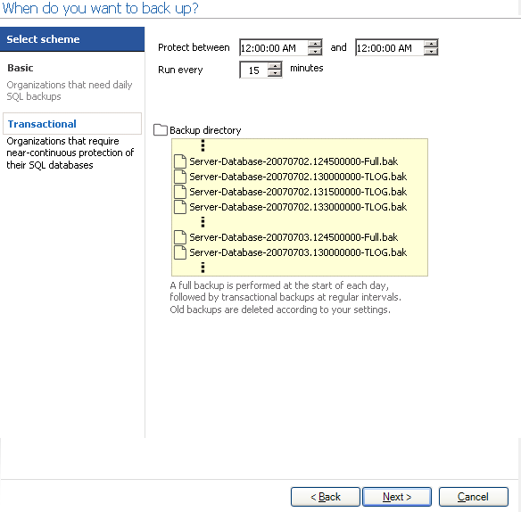 There are two schedules available for SQL Server Protection: Basic, which provides a daily backup of the SQL Server, and Transactional, which runs transaction backups through the day for point-in-time restores. - Enter the start time for each day's backup.