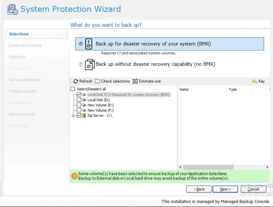This option will create an image of your system that can be used to perform a full recovery of your computer. Critical Volumes is selected by default and required for a bare-metal backup. A BMR capable backup can also be used for VM Instant Boot. You will not be able to deselect critical volumes and applications that are required for a full system recovery.