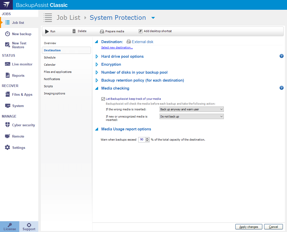 The backup media will be made bootable the first time the job runs unless you deselect the Make media bootable with RecoverAssist tick box.