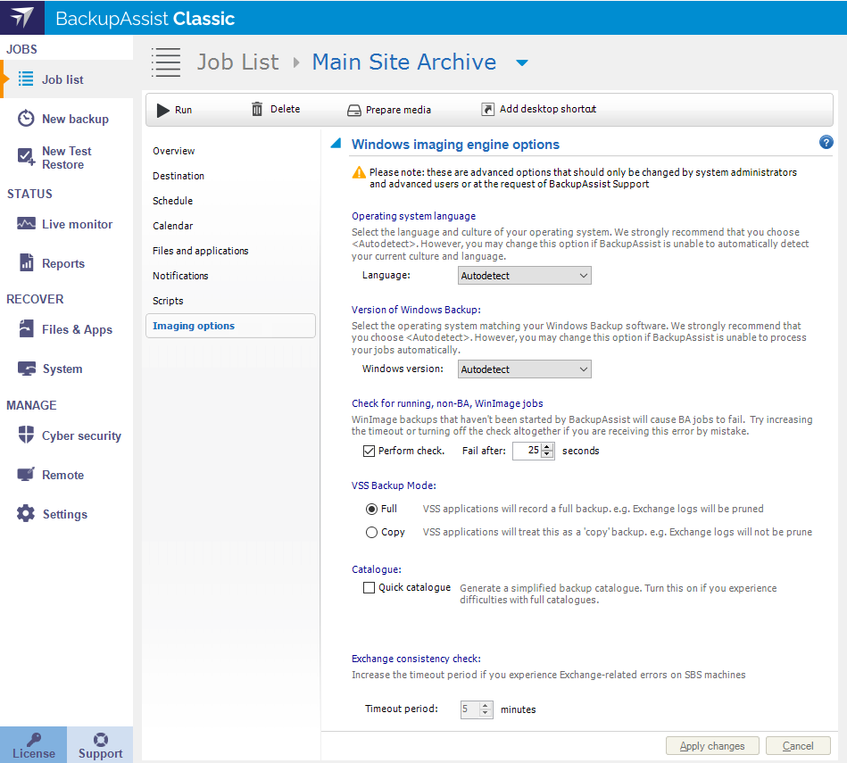 Below is a list of the sections and options available. What you see in BackupAssist will depend on the backup job's current settings.