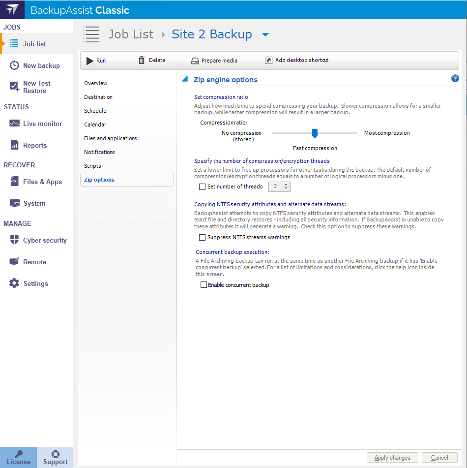 The Zip Options section allows you to modify the settings of File Archiving backup jobs. This includes enabling concurrent backups, changing the level of compression and enabling ZIP encryption.