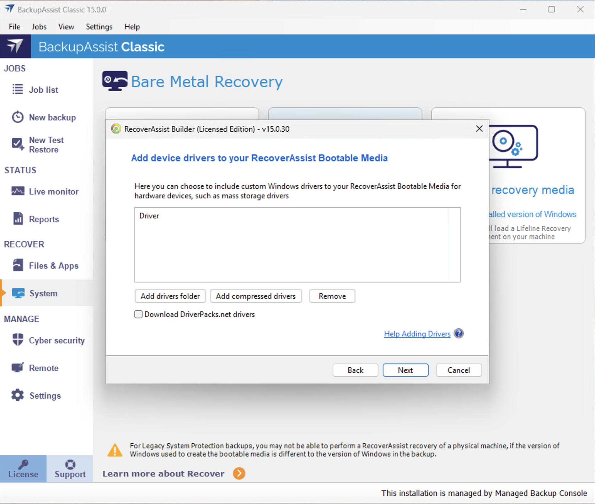 RecoverAssist let's you add your own drivers to the bootable media. These drivers may be required to give the recovery environment to the backup location and the local hardware. Make your selections, and click Next.