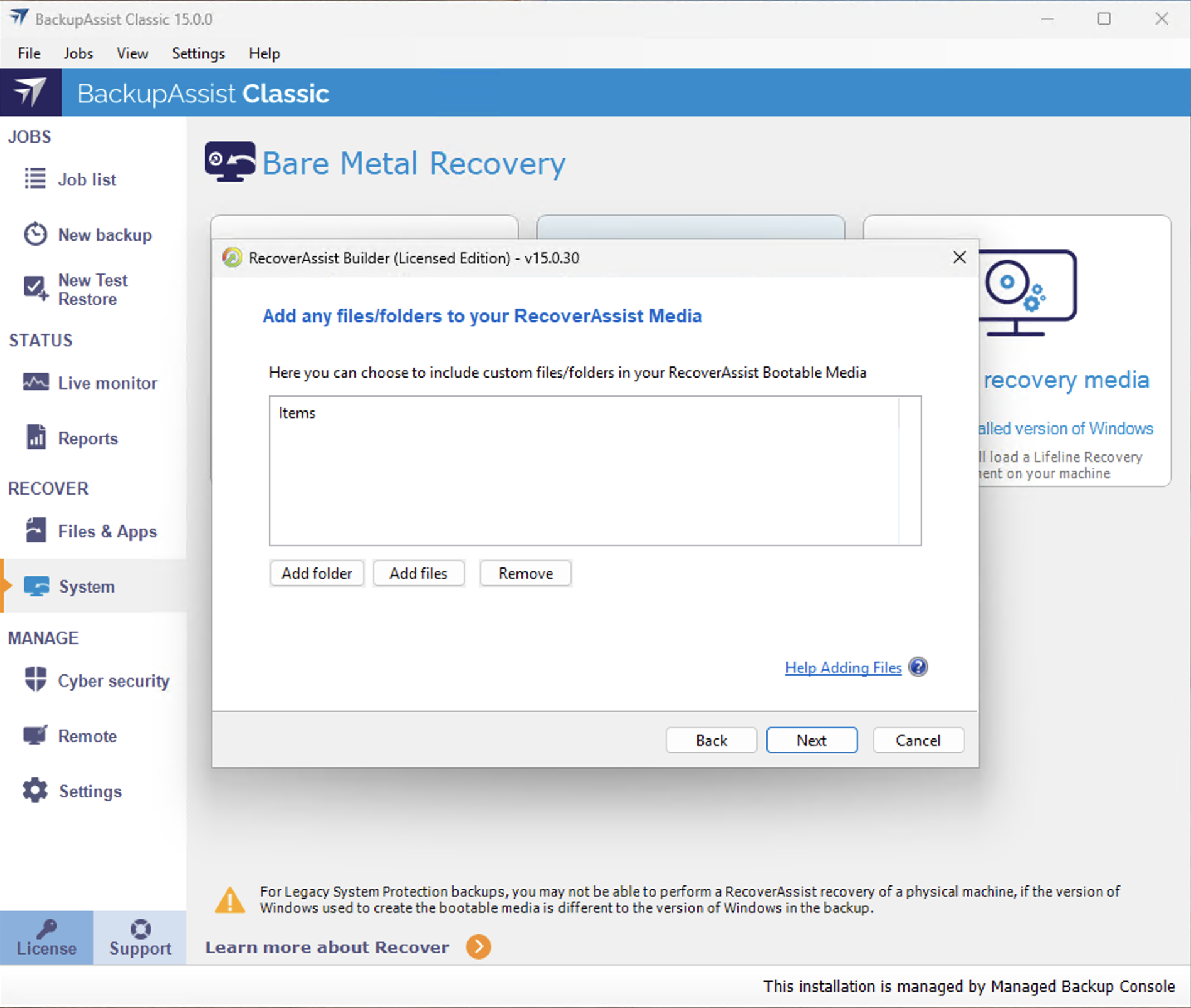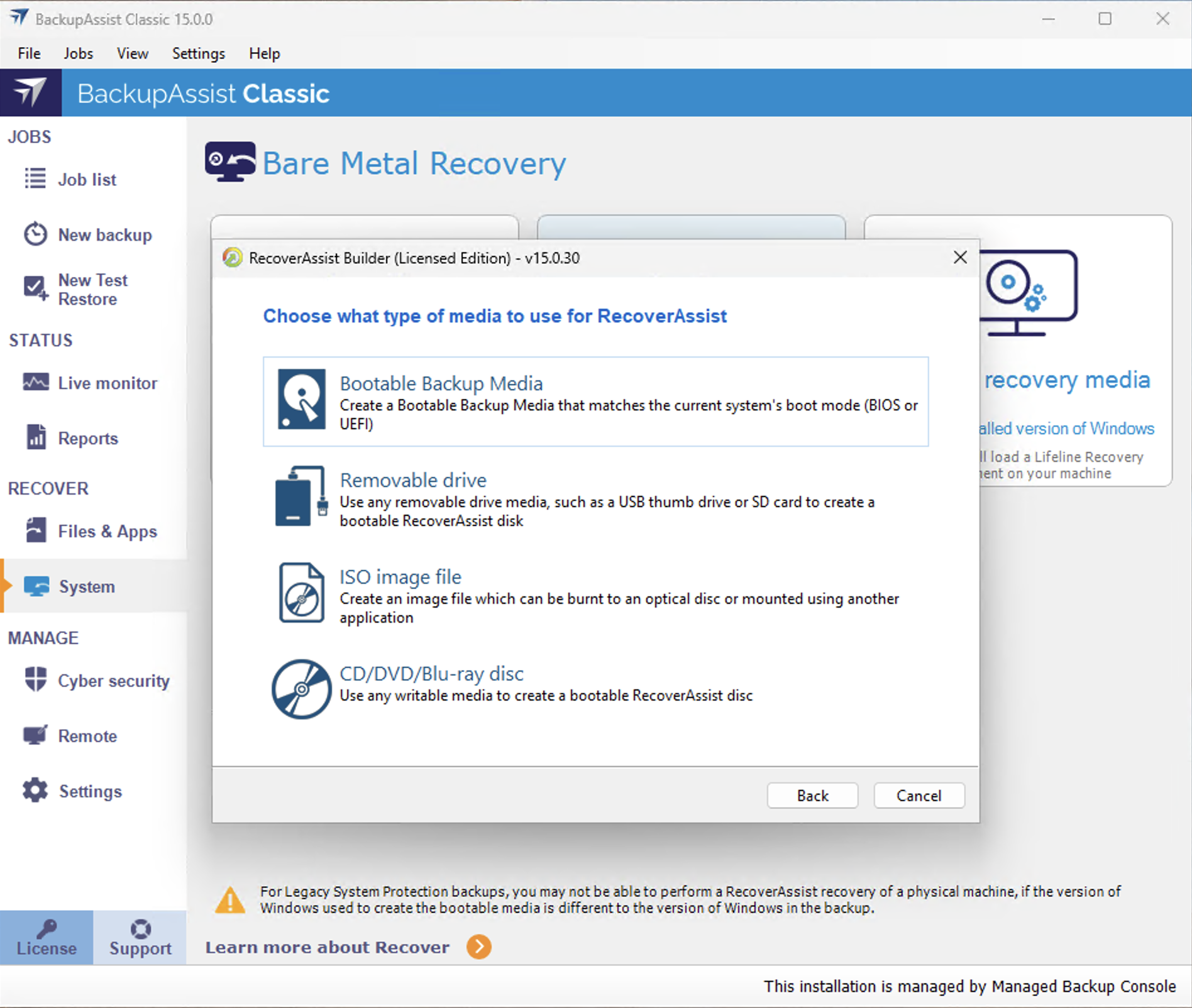 Warning: Any bootable RecoverAssist media created during the BackupAssist trial period it will expire. The RecoverAssist media will need to be re-created once a BackupAssist license has been purchased. This must be done after you purchase a license.