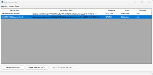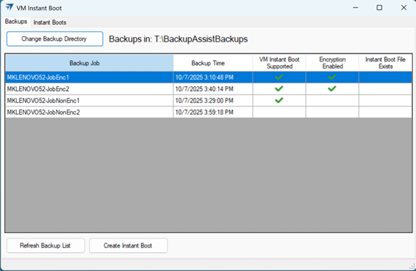 Once loaded, the table would list all the backups, and those that support VM Instant boot, as well as whether existing boot files have been created and whether they are encrypted. -