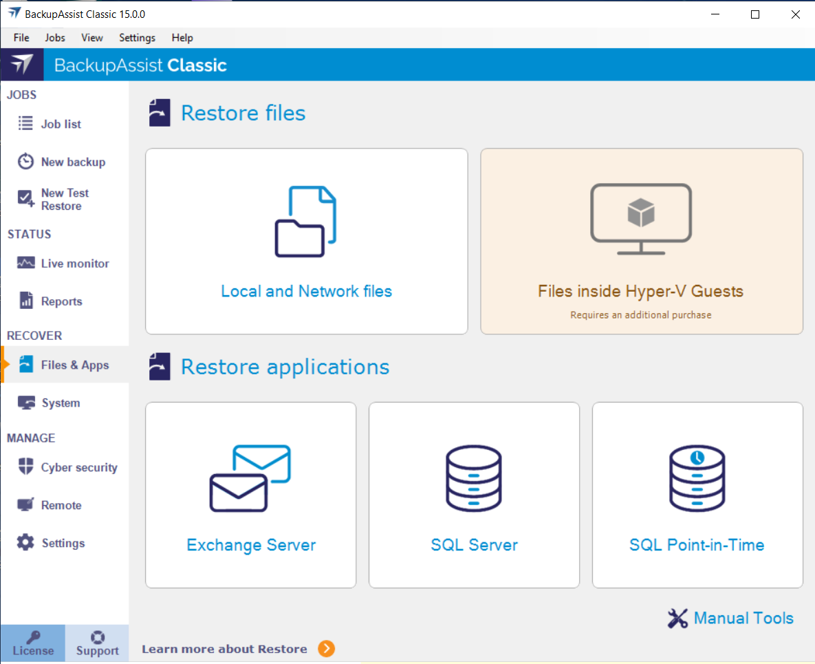 The Files\Apps tab has a Home page and a Tools page. The Home page is the default page and the starting point for performing a restore. The Tools page should only be used by experienced users or with the assistance of BackupAssist Technical Support.