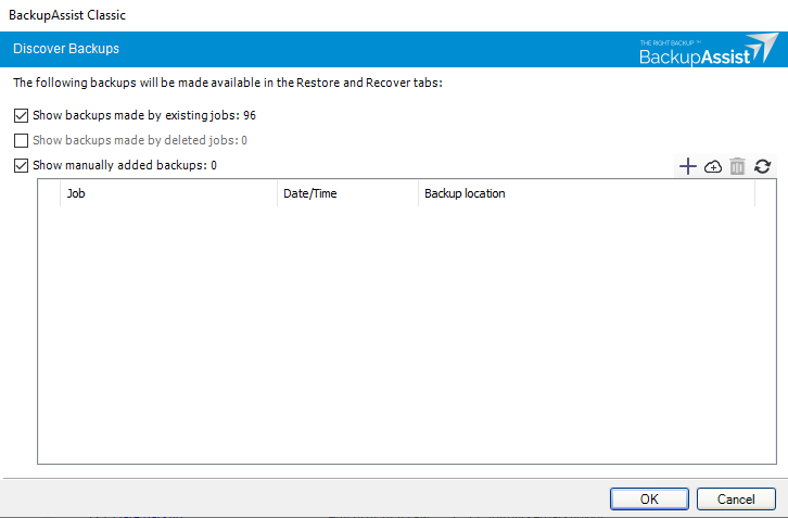 This option allows you to add and restore from backups created by other installations of BackupAssist and backups made by local jobs that have been deleted.When you select the Discover Backups button, the Discover Backups screen will appear.