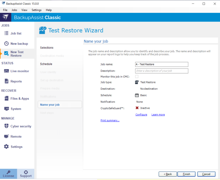 The BackupAssist Test Restore engine allows you to test System Protection (legacy and advanced), Cloud and File Protection backups to ensure they function as intend for data restores and system recoveries.